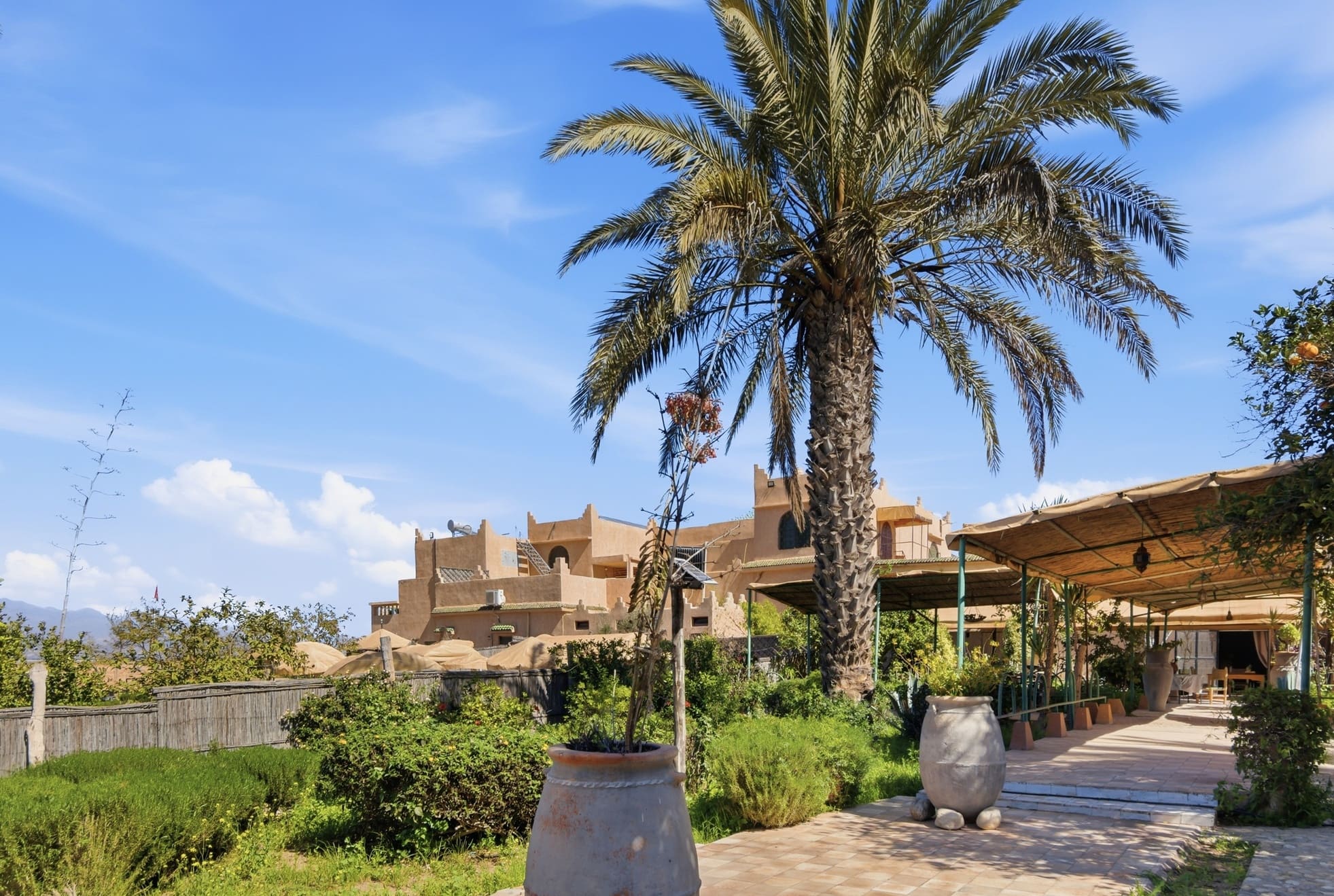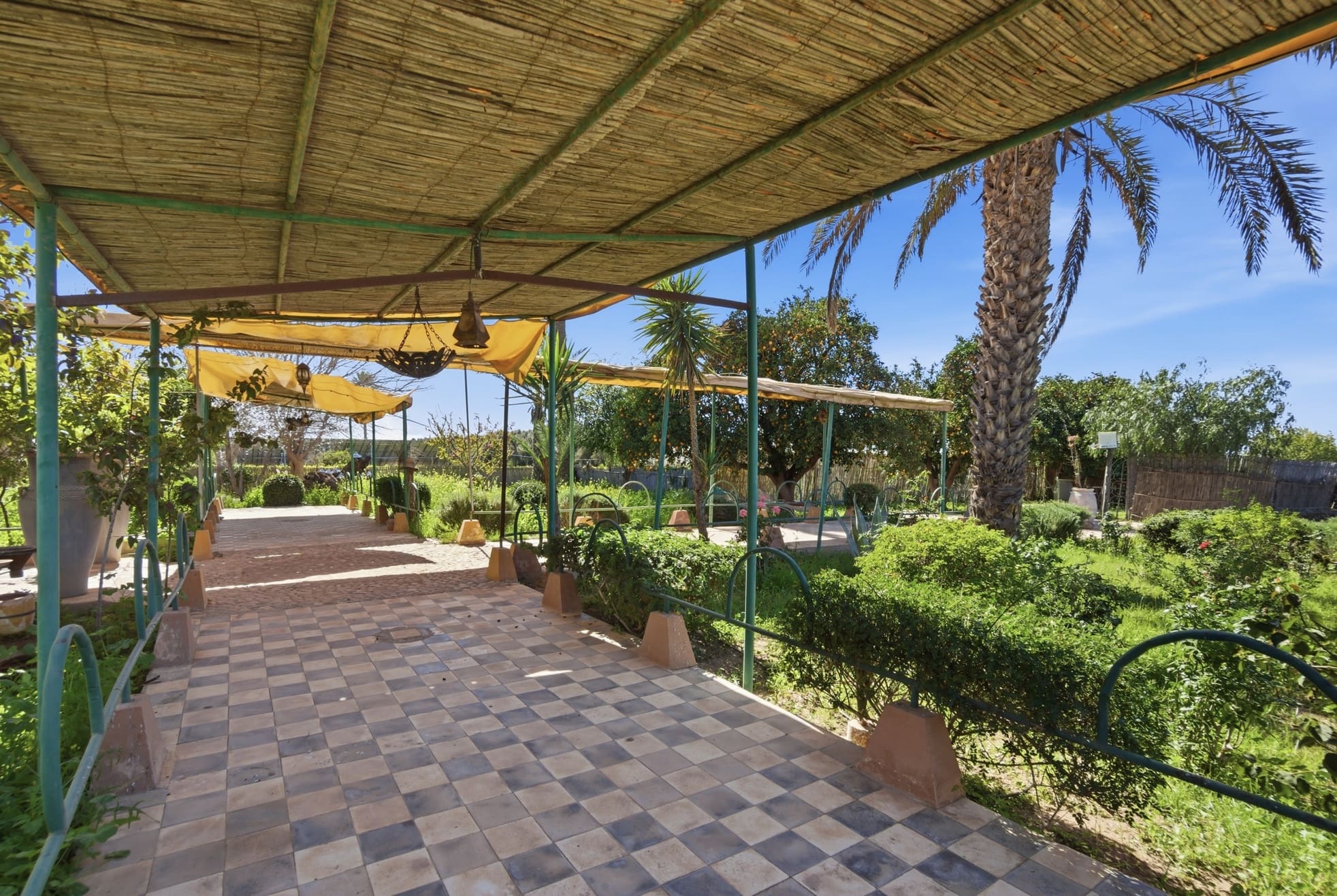 Profitez d'une maisonnette de 157m² avec 2 chambres, 2 salles de bains, 1 salons, une cuisine et une terrasse donnant sur les jardins du Riad de 2800m². Dwira 5 se compose de 2 lits doubles et 3 lits simples