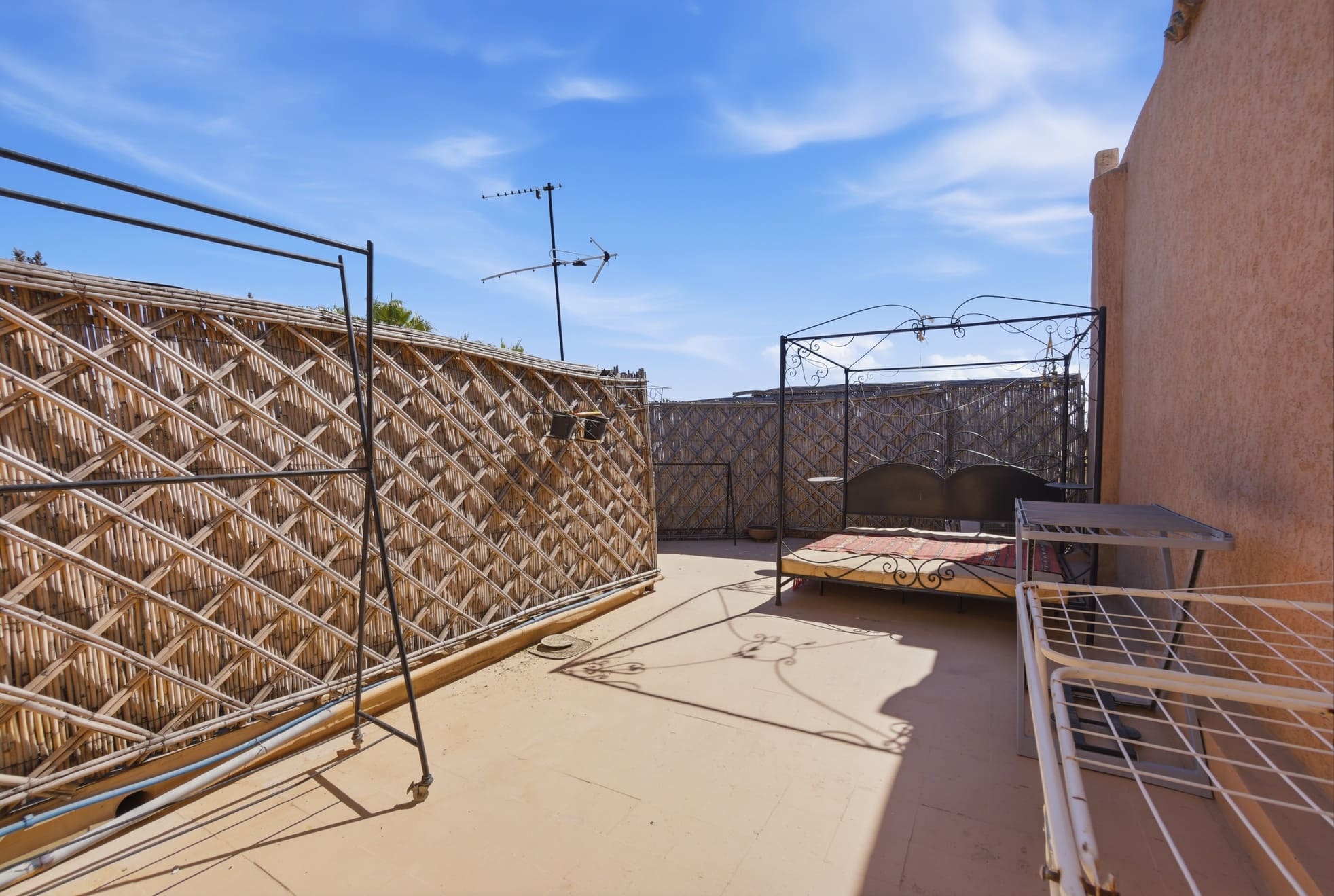 Profitez d'une maisonnette de 88m² avec 2 chambres, 2 salles de bains, 1 salons, une cuisine et une terrasse donnant sur les jardins du Riad de 2800m². Dwira 4 se compose de 2 lits doubles et 2 lits simples et 1 mezzanine